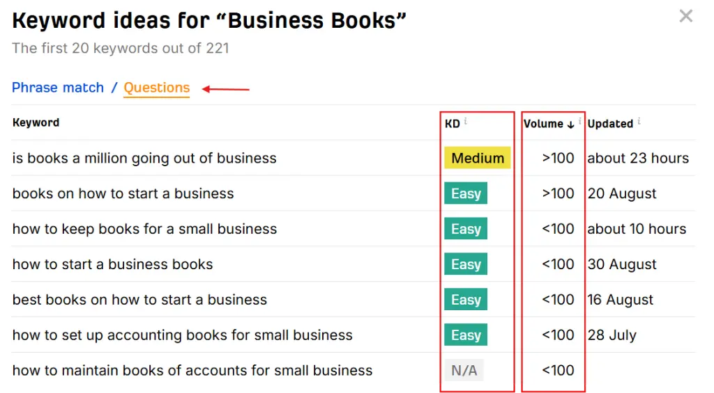 2. Use Ahrefs’ Keywords Explorer: Type a broad keyword related to your niche, “Business Books.” Filter results by search volume and keyword difficulty (KD) to find less competitive, long-tail keywords. Check the “Questions” tab for keyword ideas phrased as questions, such as: “how to start a home garden” or “best plants for home gardening beginners”.