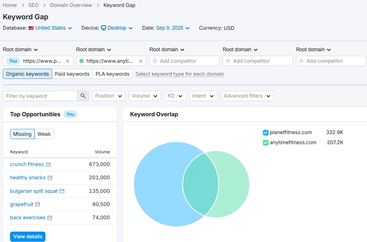 3. Find keywords you don’t have yet: Use the Keyword Gap tool to find keywords your competitors rank for but you don’t, like “home workout plans for beginners” or “virtual fitness coaching for seniors.”