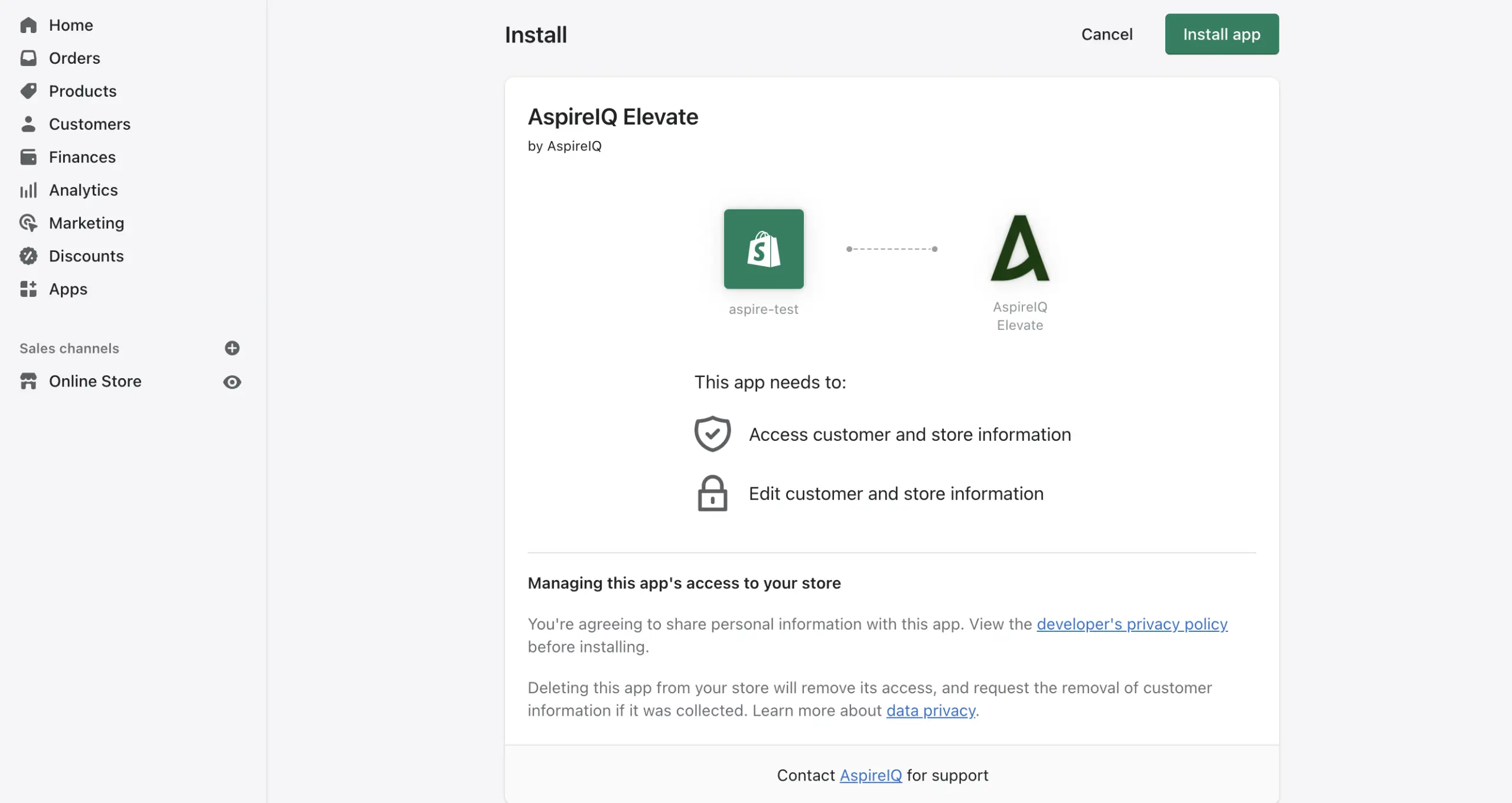 - On the Aspire app page, click Install app to authorize the connection.