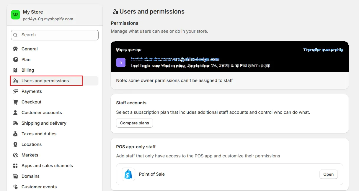 Ensure your Shopify user role allows the necessary access before proceeding. Here’s how to check: