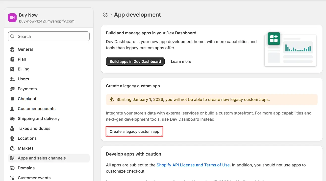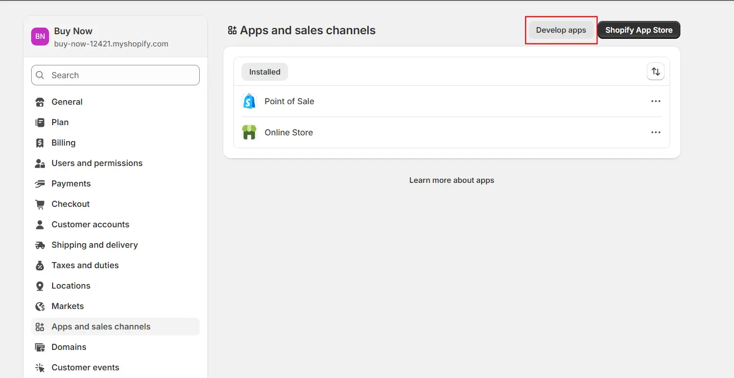 - From the same Apps and Sales Channels page, click on “Develop Apps.”
