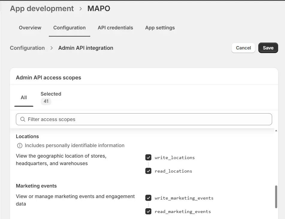 - In your custom app’s settings, go to the Admin API access scopes section.