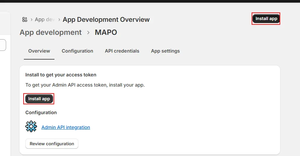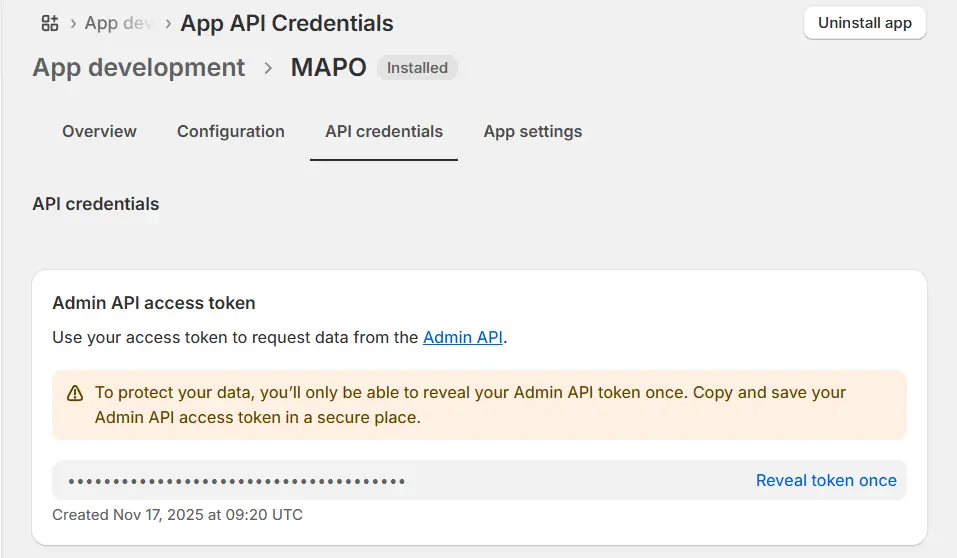 - In the Configuration tab, note your Shop Name (e.g., “yourstore” from yourstore.myshopify.com).