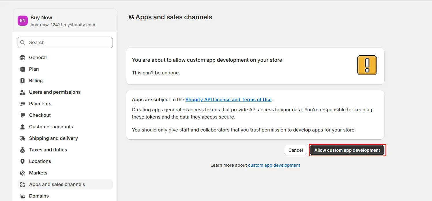 - You need a Shopify admin account with permissions to enable custom app development (store owner or staff with “Enable app development” permission).
