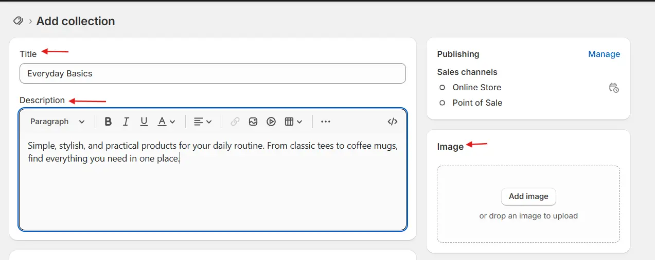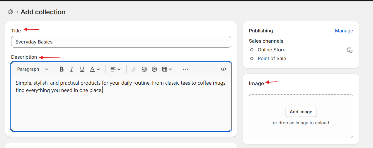 - In the Collection image, click Add image to upload a picture. Check Product Media Types for size guidelines.