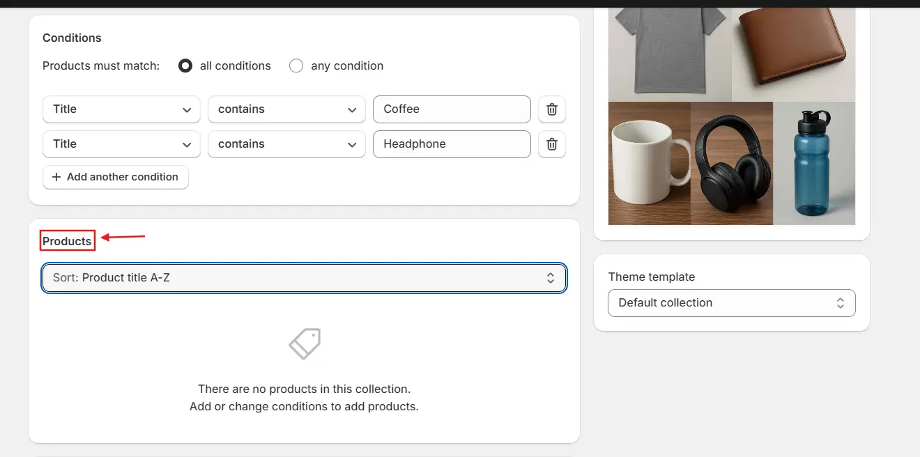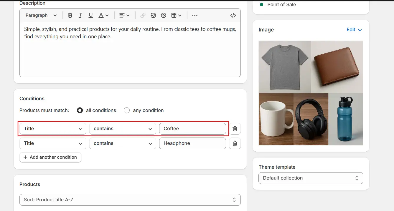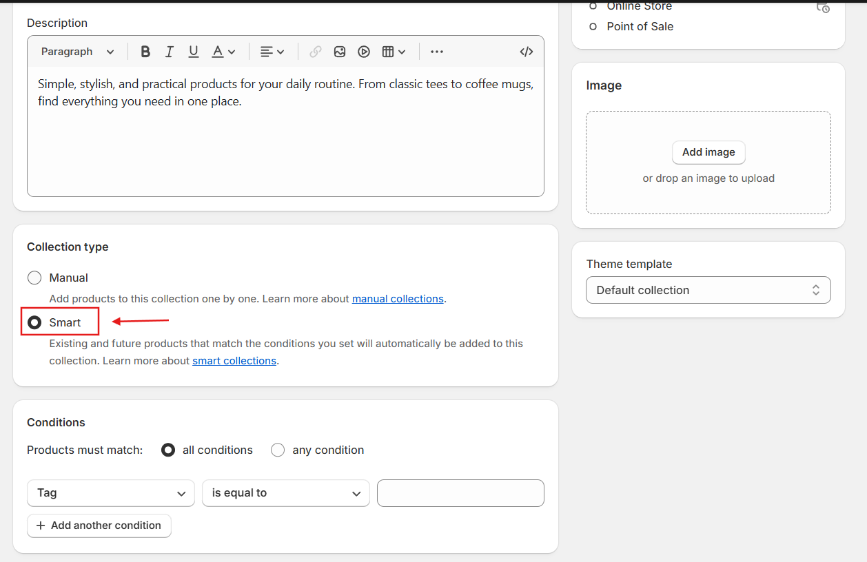 When setting up a smart collection, you can add one or more rules in the Conditions section, which also lists any existing ones.