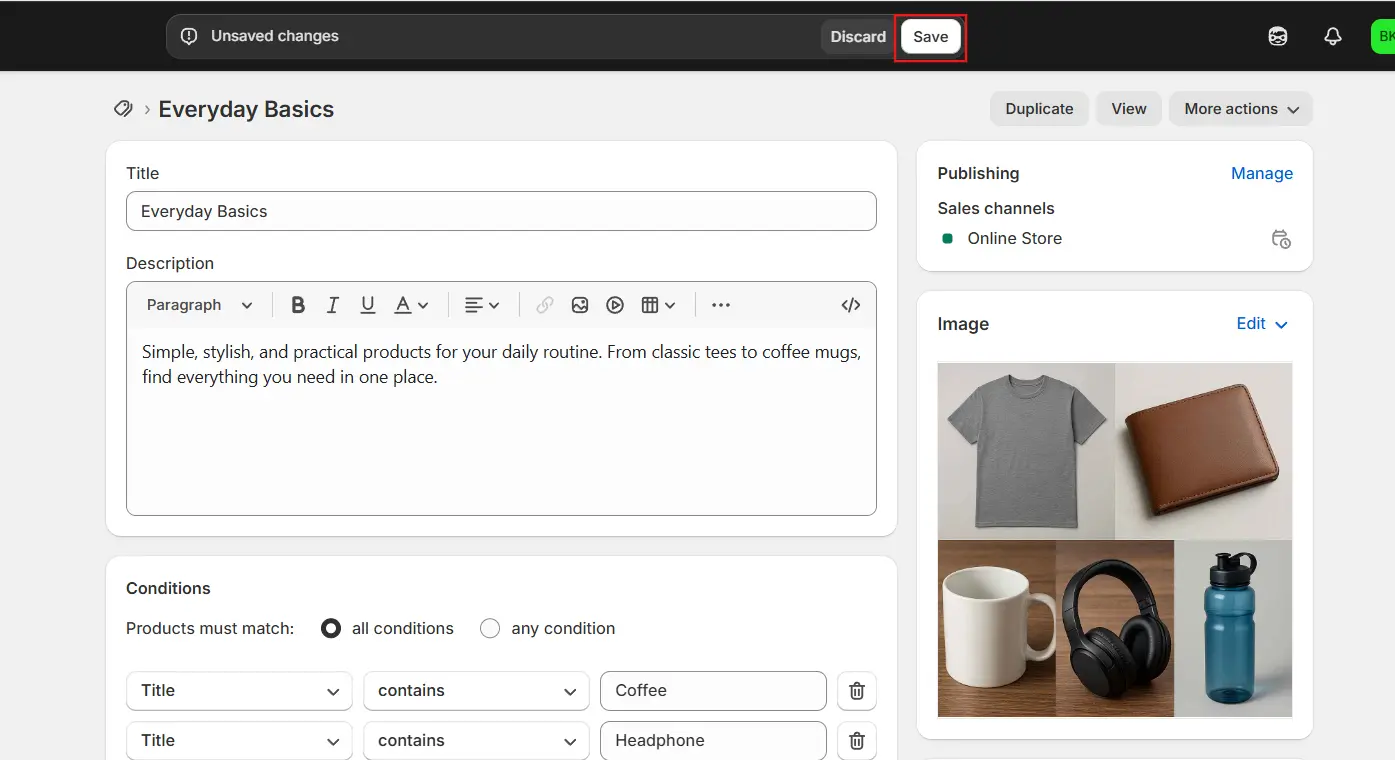 Building a smart collection means setting up rules to automatically include products that fit your criteria. You can also set a sorting order and other specifics. You are allowed to create up to 5,000 smart collections.