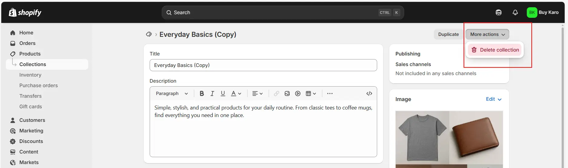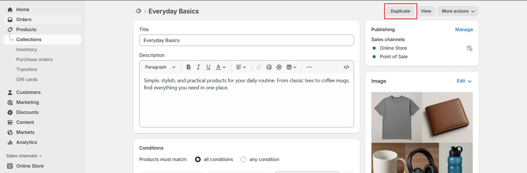You can copy an existing manual collection, keeping its title, description, image, and product list. The duplicate gets “(copy)” appended to the title and isn’t published to any channels automatically.
