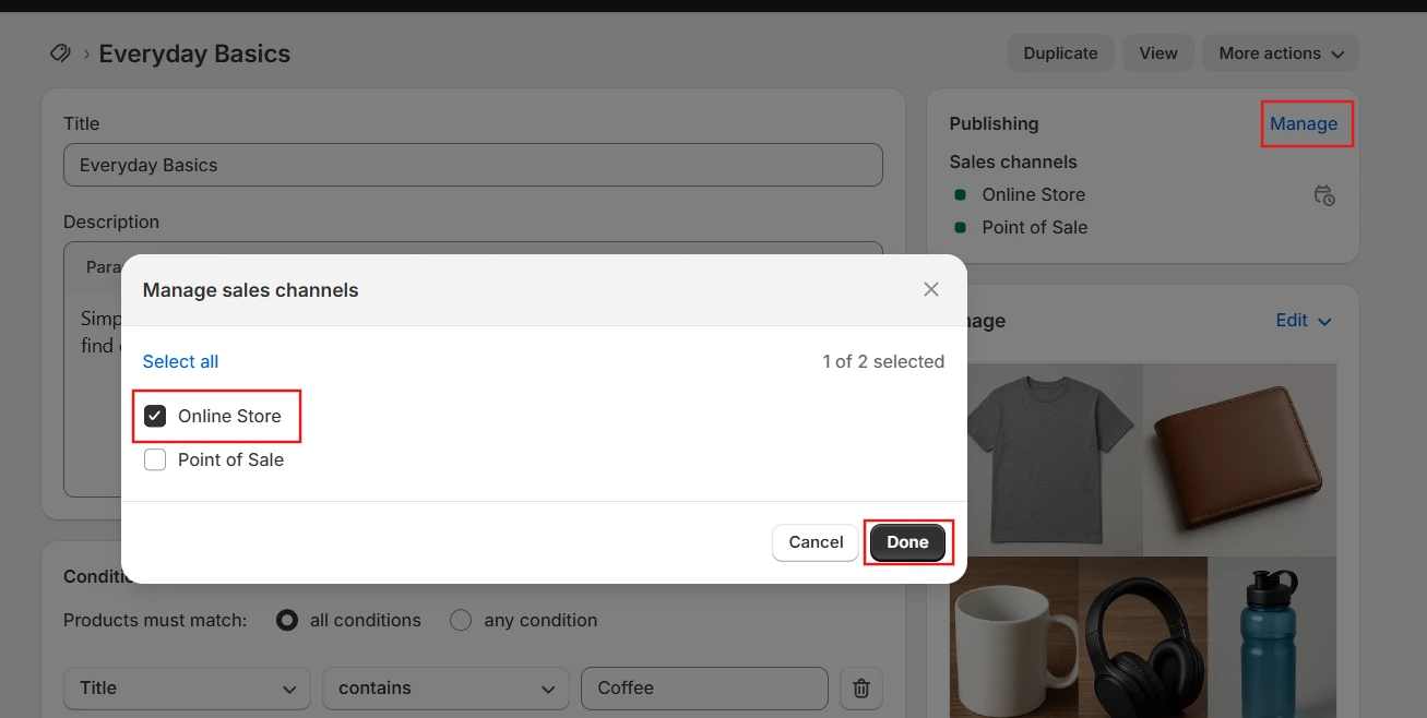 - Optional: In Sales channels, tap Edit to set visibility. It’s available on all by default; uncheck to hide from specific ones. Learn about collection visibility.