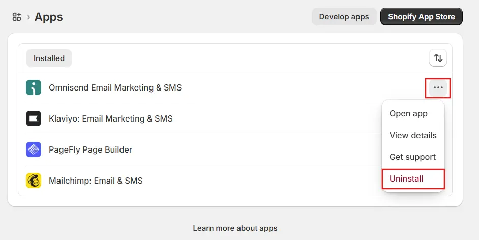 4) You may need to uninstall the app: In some cases, you must remove the app from your Shopify admin to completely eliminate it from your store.
