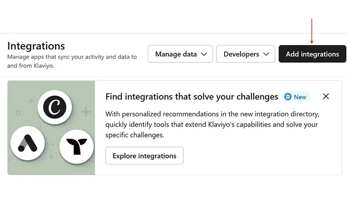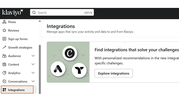 - In Klaviyo, go to the Integrations tab on the left sidebar.