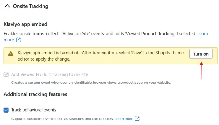 - You might notice a message stating that the Klaviyo app embed is disabled; click Turn on to activate it.