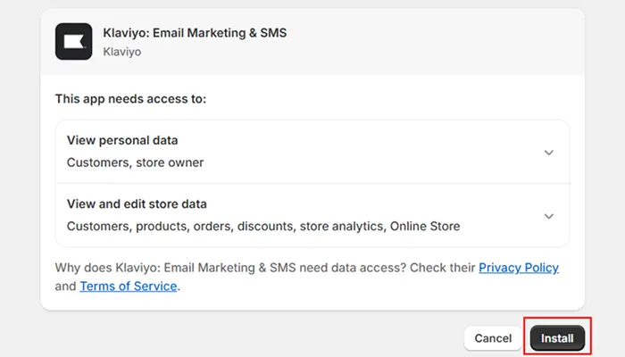 - Read through the permissions Klaviyo is asking for and click Install app.