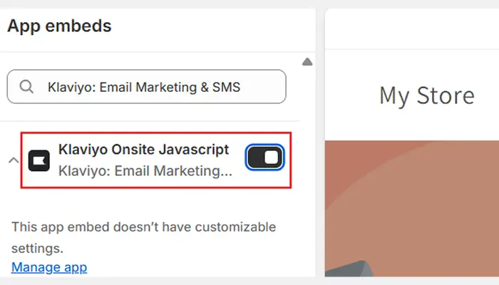 - Go back to Klaviyo and refresh the integration settings page to ensure that the app embed is on.