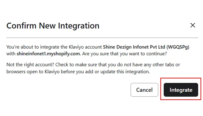 - Once brought back to Klaviyo, click Integrate to confirm the integration.
