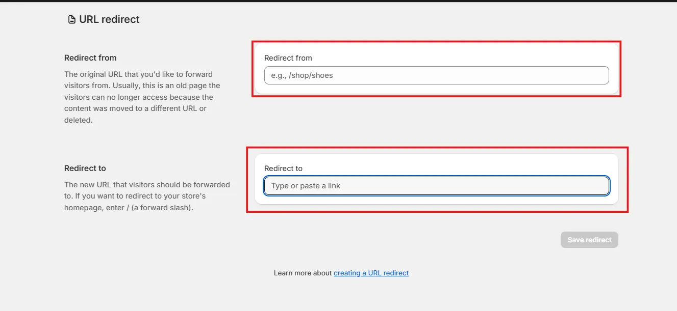 - In the Redirect from field, enter the old URL path (e.g., /old-page).