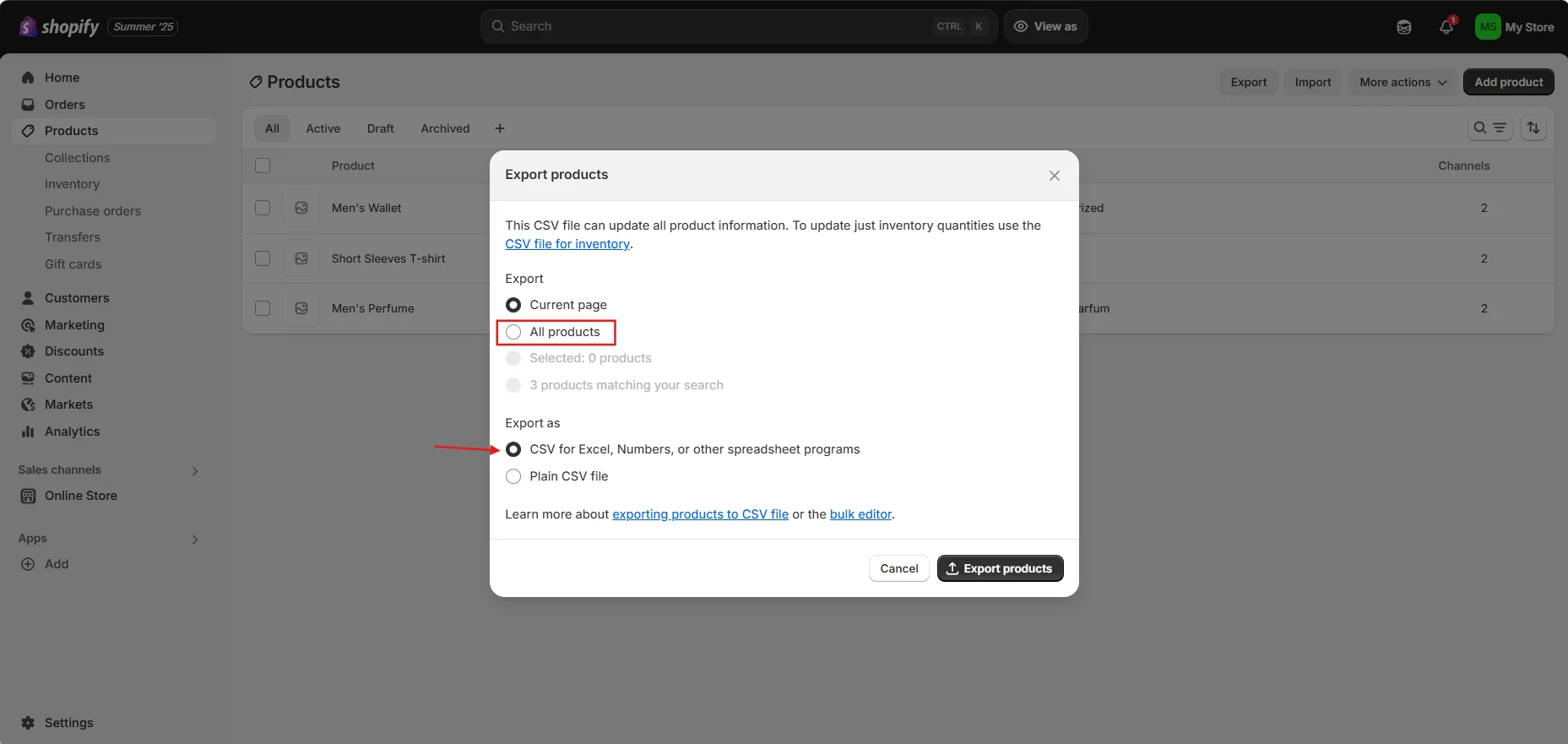 - In your Shopify dashboard, go to “Products” and select “Export.”